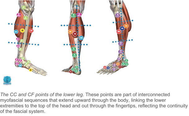 For example. In the lower limb, specific CC and CF points are identified to address movement dysfunctions. For instance, treating a densified point in the thigh’s fascia can alleviate pain in the knee or ankle due to the interconnected nature of the fascial system.
